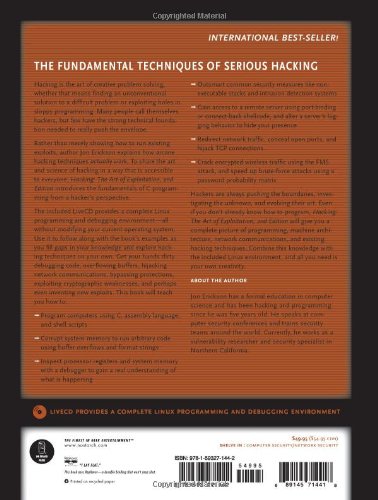 Hacking is the art of creative problem solving, whether that means finding an unconventional solution to a difficult problem or exploiting holes in sloppy programming. Many people call themselves hackers, but few have the strong technical foundation needed to really push the envelope. Rather than merely showing how to run existing exploits, author Jon Erickson explains how arcane hacking techniques actually work. To share the art and science of hacking in a way that is accessible to everyone, Hacking: The Art of Exploitation, 2nd Edition introduces the fundamentals of C programming from a hacker's perspective.The included LiveCD provides a complete Linux programming and debugging environment-all without modifying your current operating system. Use it to follow along with the book's examples as you fill gaps in your knowledge and explore hacking techniques on your own. Get your hands dirty debugging code, overflowing buffers, hijacking network communications, bypassing protections, exploiting cryptographic weaknesses, and perhaps even inventing new exploits. This book will teach you how to:Program computers using C, assembly language, and shell scripts Corrupt system memory to run arbitrary code using buffer overflows and format strings Inspect processor registers and system memory with a debugger to gain a real understanding of what is happening Outsmart common security measures like nonexecutable stacks and intrusion detection systems Gain access to a remote server using port-binding or connect-back shellcode, and alter a server's logging behavior to hide your presenceRedirect network traffic, conceal open ports, and hijack TCP connections Crack encrypted wireless traffic using the FMS attack, and speed up brute-force attacks using a password probability matrix Hackers are always pushing the boundaries, investigating the unknown, and evolving their art. Even if you don't already know how to program, Hacking: The Art of Exploitation, 2nd Edition will give you a complete picture of programming, machine architecture, network communications, and existing hacking techniques. Combine this knowledge with the included Linux environment, and all you need is your own creativity.