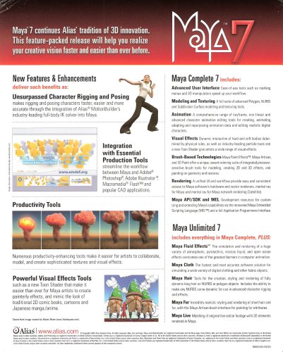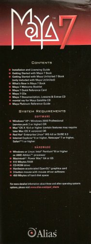 Maya 7 Continues Alias Tradition 0f 3d innovation this feature packed realise will help you realize your creatived visin faster and easier than ever before It contains : Modeling And texturing, Animation , Visual Effects, Brushed Based Technologies,Rendering , maya api SDk and mel , maya Unlimited 7, Maya fluids Efects , Maya cloth,Maya hair, Maya fur,maya Live, Productivity tools, Numerous productivity enhacing tools make it easier for artist to collabortae model , and created sophisticated textures and visual Effects . Contents: - Installation and licencing guide, Getting Starded with Maya 7 book , (only included with maya umlimited) ,Whats new in maya 7 Book, Maya 7 welcome Booklet Maya 7 quick reference card, maya 7 Cd's , maya 7 documentation , lessons , 7 &extras cD , Metal Rayd, for maya satelite Cd , Maya Platinum Refence Guide, systems requirements it supports Windows, Mac ,Linux, Hardware; Windows or linux : Intel Pentium III or higher or amd athlon tm processor,Macintosh,Power Mac , g 4 or g5 , 512 Mbytes ram ,Cd-Rom har drive, Hardware accelerate open gl , Graphics card 3 buttom mouse with mouse driver sofware , 450 mbytes of hard disk space. =Maya Education 7 = this is part of what it says on the box , please be sure the before buying it to read because you may need this sofware or may not because if i make a refund i will lost money because amazon.anyways keeps the fees if it sells and i later have to refund customer because customer says the he is not happy with the sofware. =This is what it says in the booklet on the images you can what it really contains it has 7 books and 7 Cd's' to be true i have no idea on what it contains in each Cd since iam not so familiar with sofwares, i am just beginig to used computers =